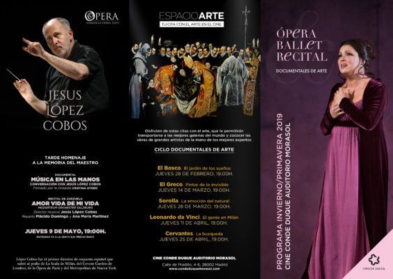 El Cine Conde Duque Auditorio Morasol, de la c/ Pradillo,4, (detrás del Auditorio Nacional de Música, metro Concha Espina) comunica el nuevo programa para la temporada primavera 2019. Los espectáculos podrán disfrutarse desde febrero hasta junio, y contarán con repertorio en ópera, ballet y documentales de arte.