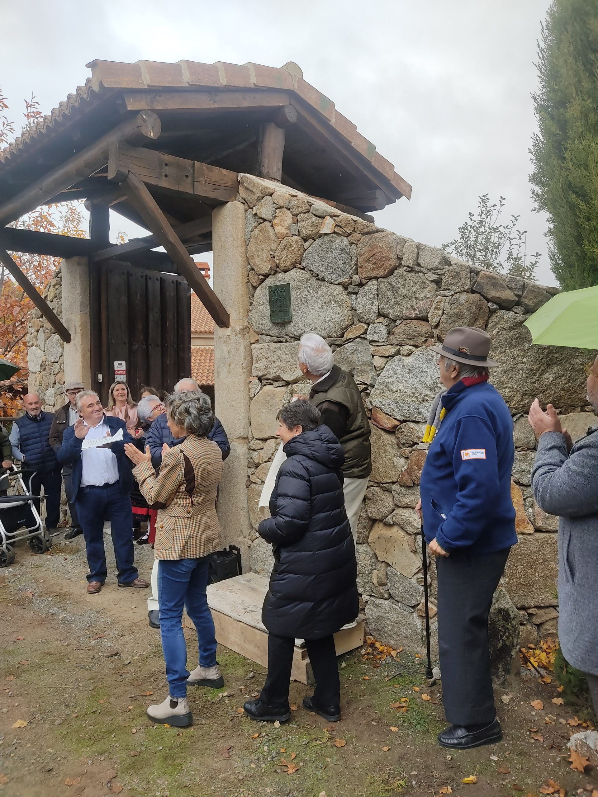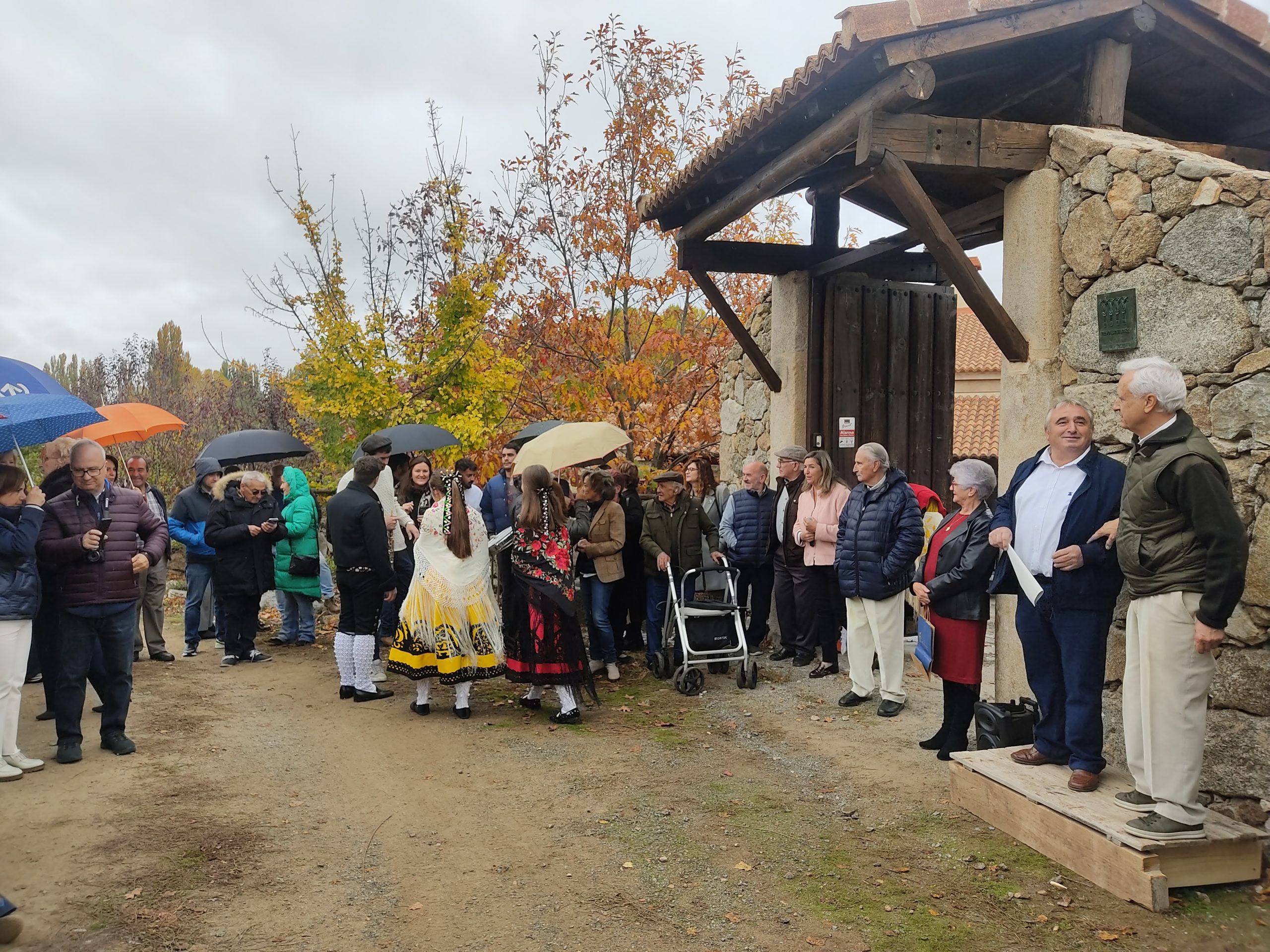 La terca llovizna seguía cayendo, el cielo se volvía cada vez más plomizo y los invitados empezaron a despedirse: poco a poco todo se llenó de abrazos, felicitaciones, buenos deseos, … y mirando de nuevo la placa, ya en los coches, los asistentes recorrieron de nuevo, ahora ya expertos, el camino de vuelta a sus casas. Allí quedó el molino, a las faldas de Gredos, rodeado de los colores del otoño, impregnado por una neblina húmeda, con el Corneja a su espalda.