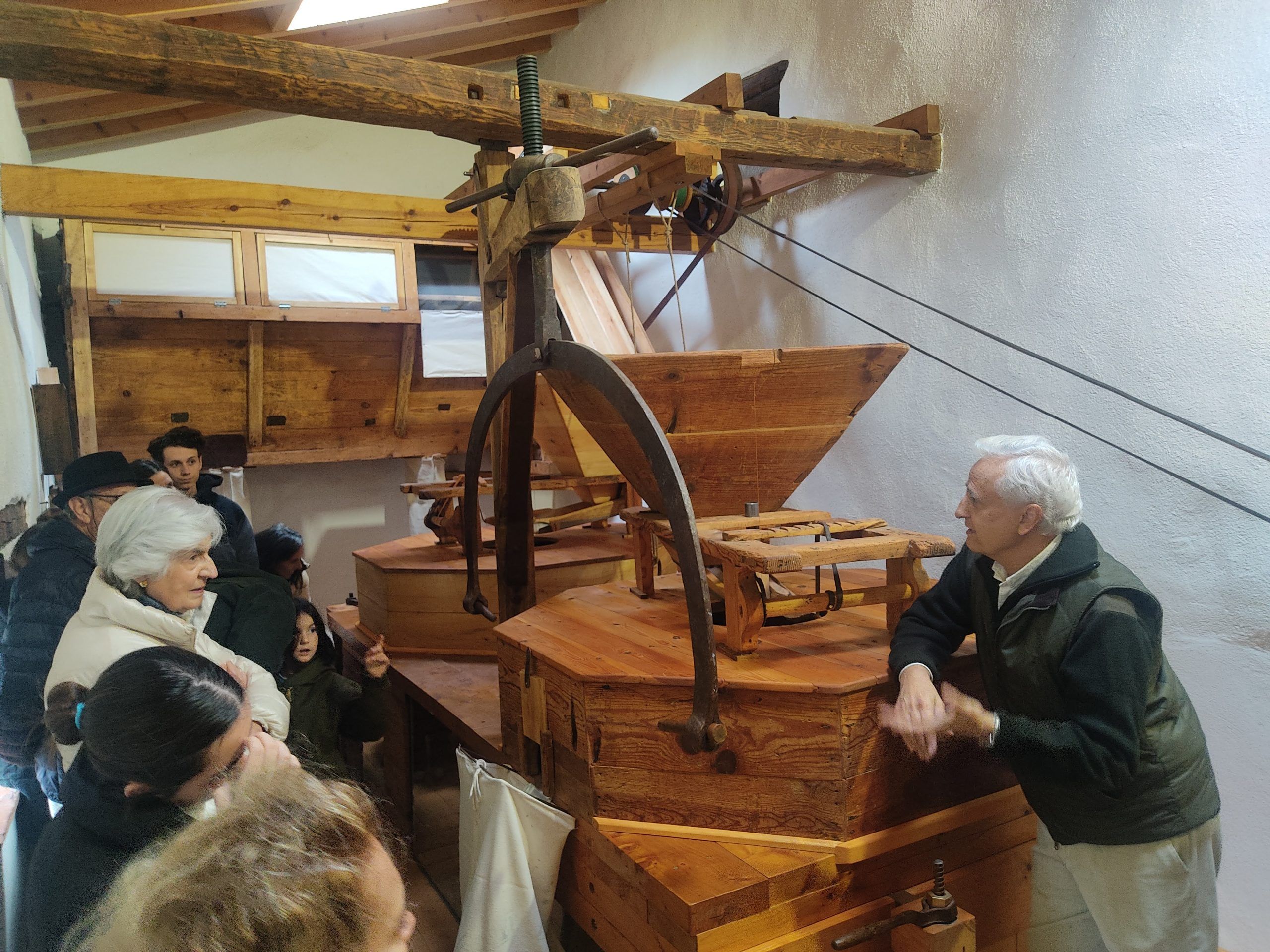 Mientras tanto, los presentes visitaban el molino, comentaban la cartelería, buscaban sus trabajos y se enorgullecían del resultado final; admiraban las dimensiones de los rodeznos, los nuevos cangilones (idénticos al único original conservado), las engrasadas y tirantes correas de cuero, los sólidos engranajes, los poderosos saetines y sus espigadas llaves, la cuidada madera de tolvas y guardapolvos, las ingeniosas canaletas, la vieja romana, las antiguas medidas, y las delicadas sonajas; otros miraban curiosos el monitor con imágenes que recorrían el proceso completo de la rehabilitación del molino y su entorno, se reconocían en muchas actividades y se sentían parte de una historia que había durado catorce años y que nos había proporcionado a todos momentos especiales y cercanos.