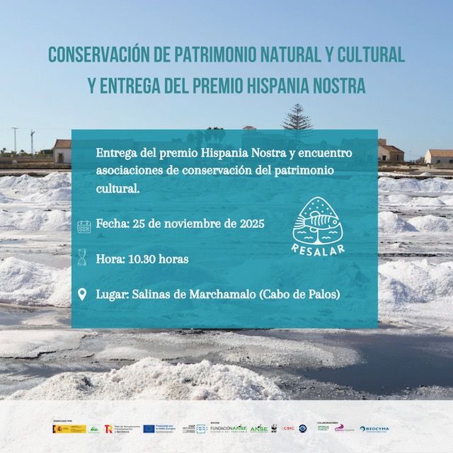El martes 25 de noviembre, tras la cancelación del pasado mes de octubre por la Dana sufrida, tendrá lugar el acto de descubrimiento de la placa del Premio Hispania Nostra concedido a la «Restauración de las salinas viejas de Marchamalo (Cabo de Palos)»