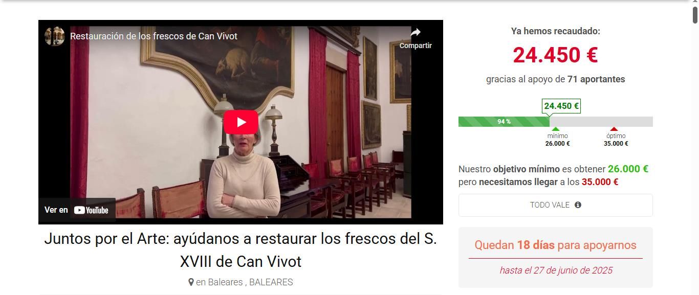Madrid, 9 de junio de 2025- Can Vivot, un legado familiar del siglo XV, es el único palacio de Palma de Mallorca que conserva intactos su mobiliario y decoración originales de los siglos XVII y XVIII. Pero sus extraordinarios frescos necesitan una restauración integral, y desde la Asociación Can Vivot, una entidad sin ánimo de lucro fundada en 2022, se han puesto en contacto con la asociación Hispania Nostra para tratar de conseguir por medio de una campaña de micro mecenazgo los 26.000€ que necesitan para ello (como objetivo mínimo) o los 35.000€ que han establecido como su objetivo óptimo. La campaña, que comenzó hace pocos días, ya ha logrado reunir 24.450€ gracias a la generosidad de 71 donantes, entre ellos la Fundación Madina Mayurka, que ha aportado 12.000 €, o particulares como Gerd Peter Harf que han donado 5.000 €. Solo les quedan 18 días, hasta el 27 de junio, para lograr reunir todo el dinero.