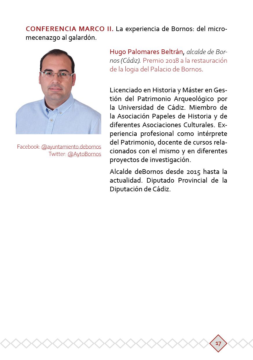 13.15 14.15 Conferencia marco. La experiencia de Bornos: del micromecenazgo al galardón. Premio 2018 a la restauración de la logia del Palacio de Bornos.